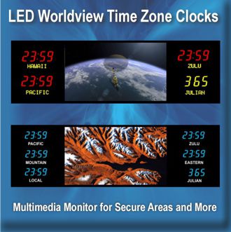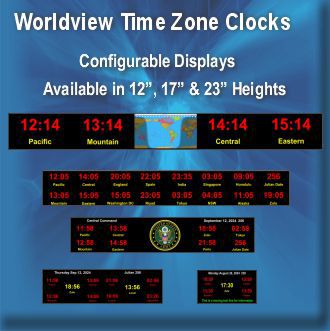 The Worldview Time Zone Series offers one, two, three, four and 5 Monitor Time Zone Clocks housed in a single Aluminum Frame. Monitor sizes include 12", 17" and 22" heights