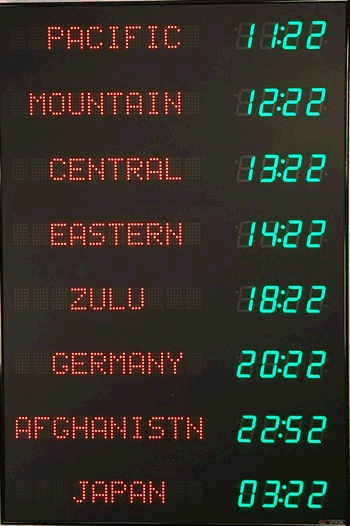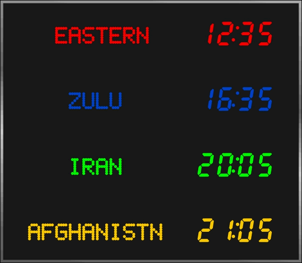 4 Zone Time Zone Clock with Yellow LEDs for the Zone Labels. |