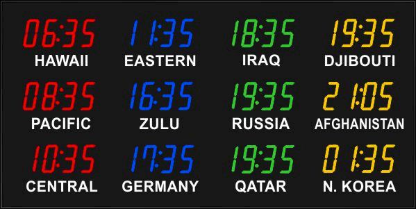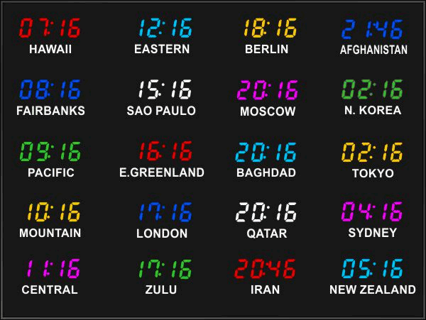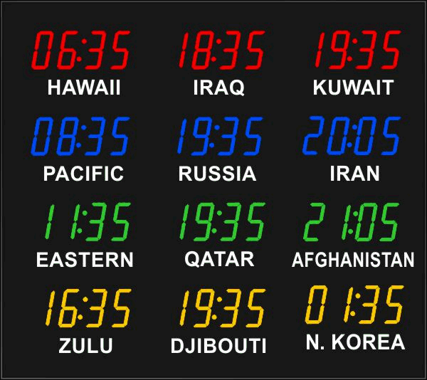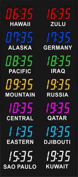 The 662 series time zone clocks have bar-segment LED time with white vinyl zone labels below the time of each zone. The 662 models can display 4 to 24 time zones.