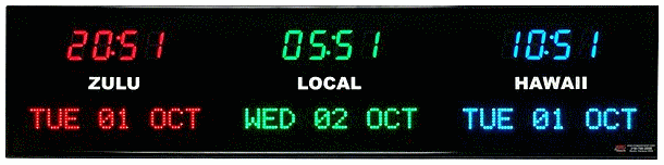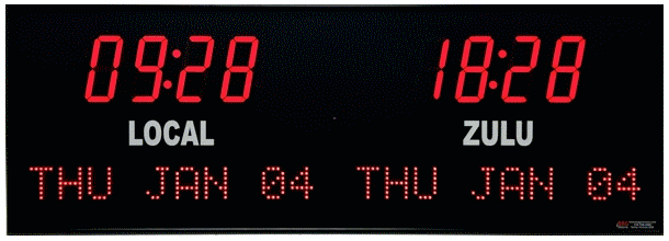 6637A | 2 Zone Clock with 1.8"red bar segment LEDs for the time, green 1.2" dot matrix LEDS for the date and 0.75" white vinyl lettering for the zone labels. | |