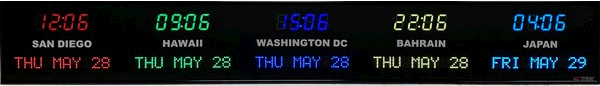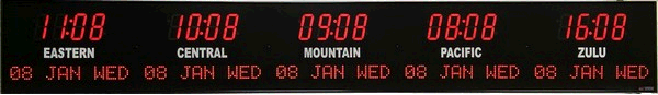 6637E | 6 Zone Clock with 1.8" blue bar segment LEDs for the time, yellow 1.2" dot matrix LEDS for the date and 0.75" white vinyl lettering for the zone labels. | |