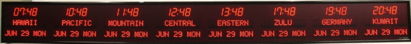 6673R | 8 Zone Clock with 2.5 " red bar segment LEDs for the Time and green 1.2" dot matrix LEDs for the date & zone labels |