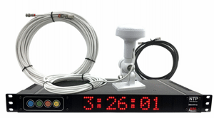 The rack mount device can be placed anywhere within the network layout. The built in high sensitivity GPS receiver is able to lock on to multiple satellites, in some cases, from within many buildings or from a window location. The dome outdoor antenna includes 25 feet of antenna cable, plus another 100 foot extension cable for a total length of 125 feet. Additional cable may be added as needed. Up to 325 feet of low-loss 70 ohm antenna cable can be used without signal loss.