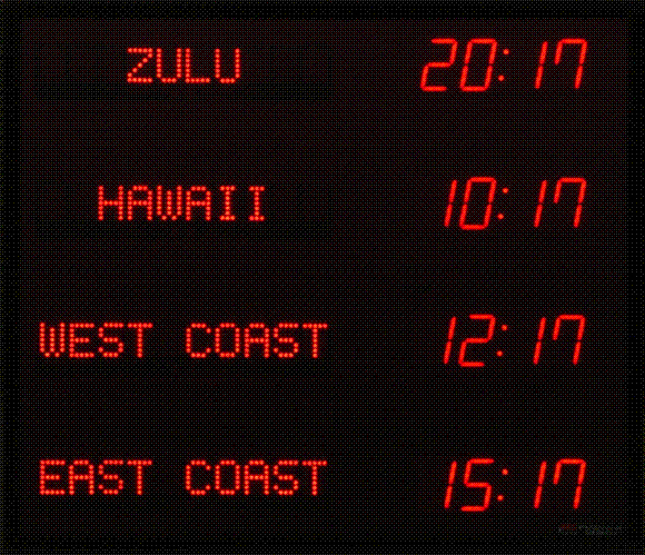4 Zone Time Zone Clock with Yellow LEDs for the Zone Labels. |