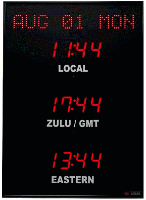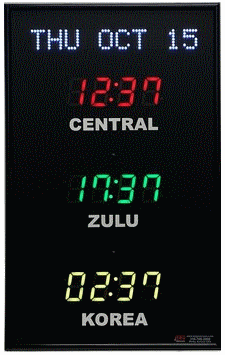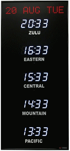 The 368 series time zone clocks has a dot matrix LED date, bar-segment LED time displays with white vinyl zone labels. The date can be arranged in any format and can include Julian dates. For instance you could have 14 APR 08 or FRI APR 14. The 368 models display between 2 and 10 time zones.