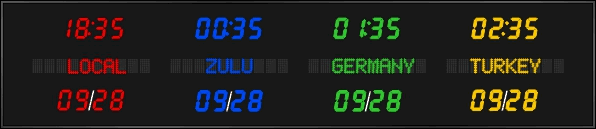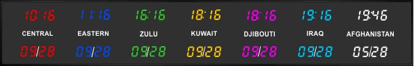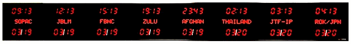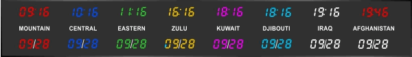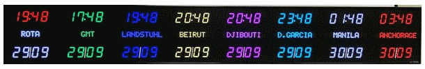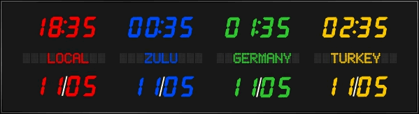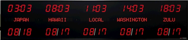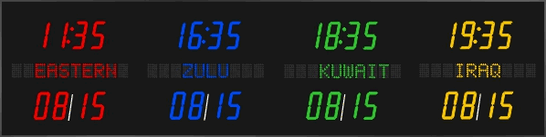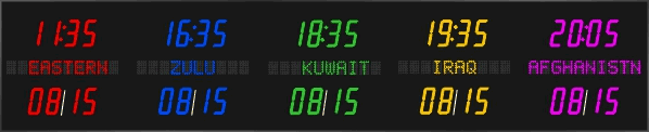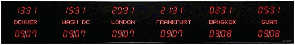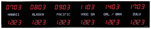 5 zone time zone clock with blue dot matrix LEDs for the zone labels |