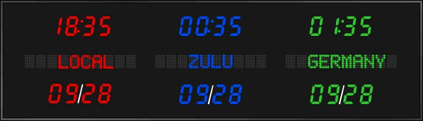 3 zone time zone clock with blue dot matrix LEDs for the zone labels | |