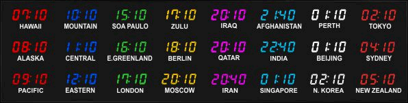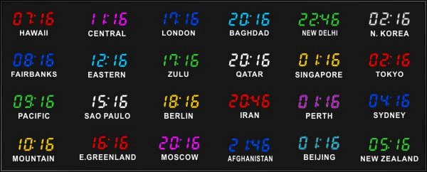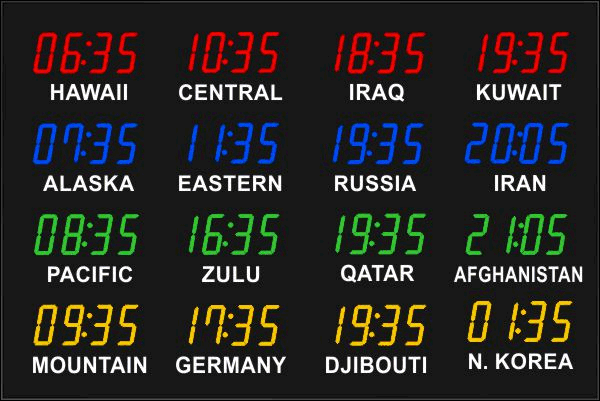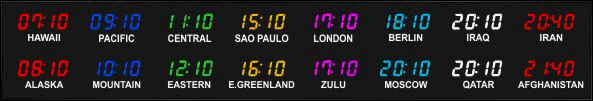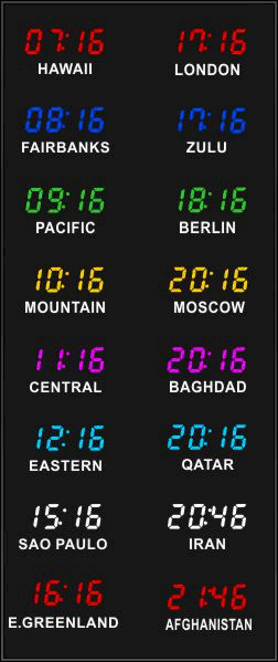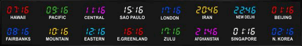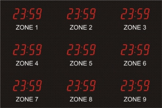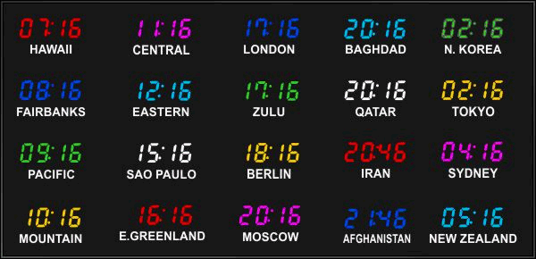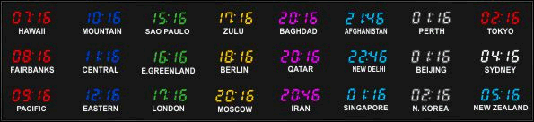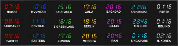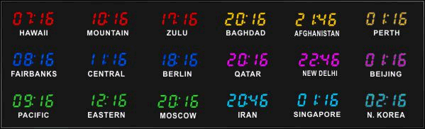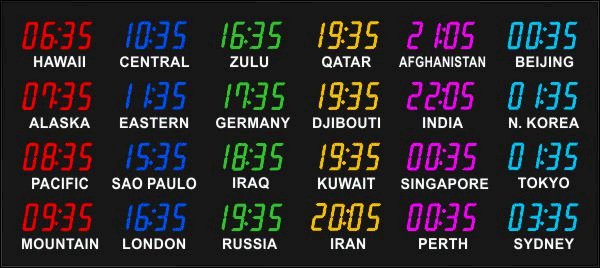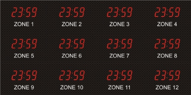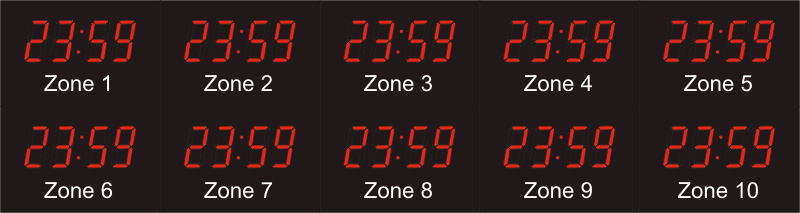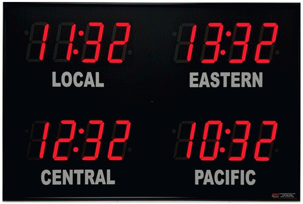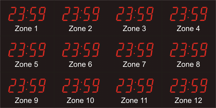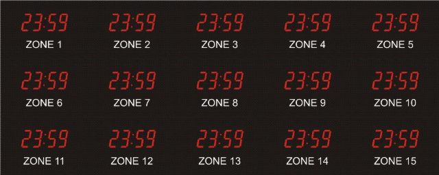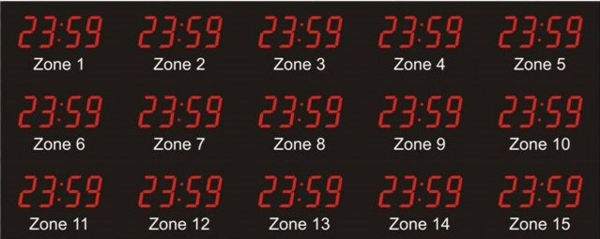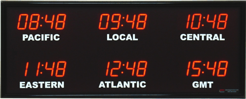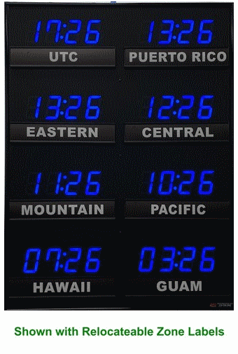 The 662 series time zone clocks have bar-segment LED time with white vinyl zone labels below the time of each zone. The 662 models can display 4 to 24 time zones.