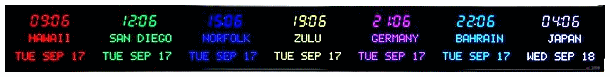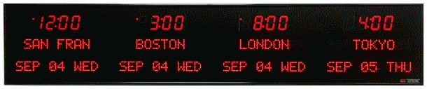 time zone clocks have bar-segment LED time displays with a ten character dot
