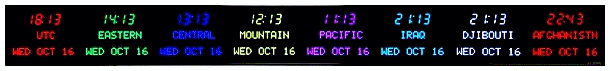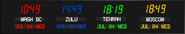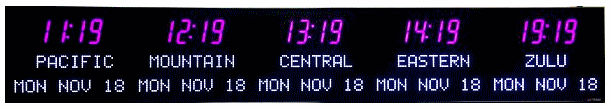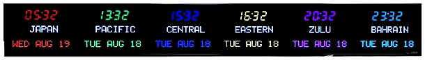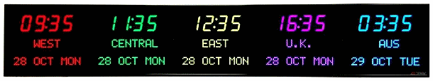 | 6673P | 6 Zone Clock with standard 2.5" red bar segment LEDs for the Time, 1.2" green dot matrix LEDs for the zone labels and 1.2" yellow dot matrix LEDs for the date | |