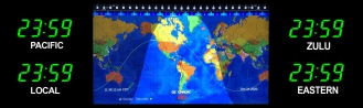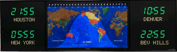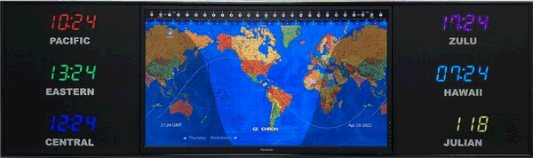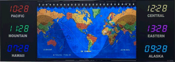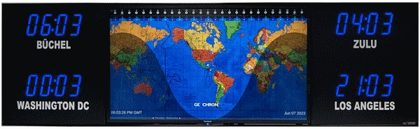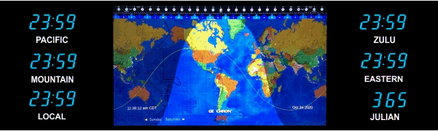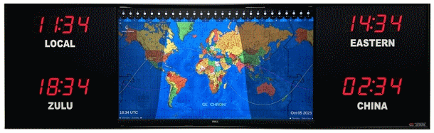 BRG Geochron Time Zone Clocks feature a 32" or 43" LED/LCD 4K Geochron Moving Map display centered in the clock. On each end of the clock are 4, 6 or 8 time zones set to the time zones you select. BRG offers white vinyl or digital dot matrix zone labels to indicate the selected zones. The smallest details are easily readable on the high resolution 4K Moving Map display. The BRG Geochron shows sunlight and darkness across the globe. In addition you can display any of the following overlays:
